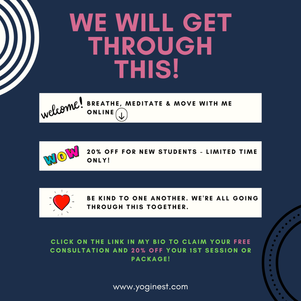 You can breathe, meditate & move with me 100% online. Click the link in my bio to sign up for your ✨FREE✨ consultation & get 20% OFF for a limited time if you’re a new client. We can get through this together! ⠀